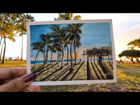 Waikiki sunset beach park watercolor painting 5x7 inch